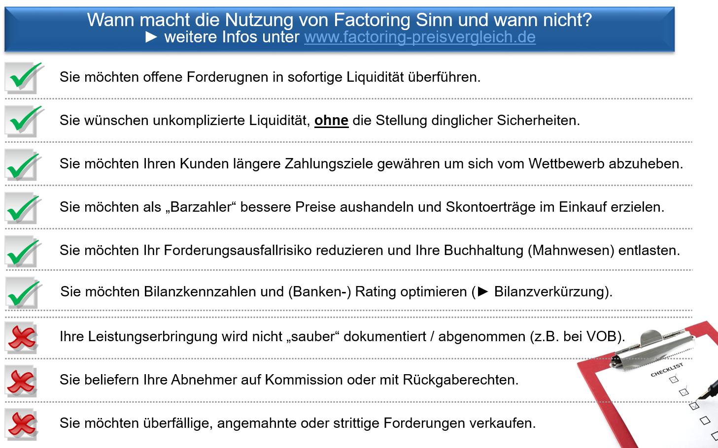 sind. Besonders bei VOB-Projekten sind detaillierte Nachweise wie Stundenzettel, Teil- oder Schlussrechnungen mit expliziten Abnahmen essenziell. Ansonsten kann kein Factor die Forderung(en) ankaufen.