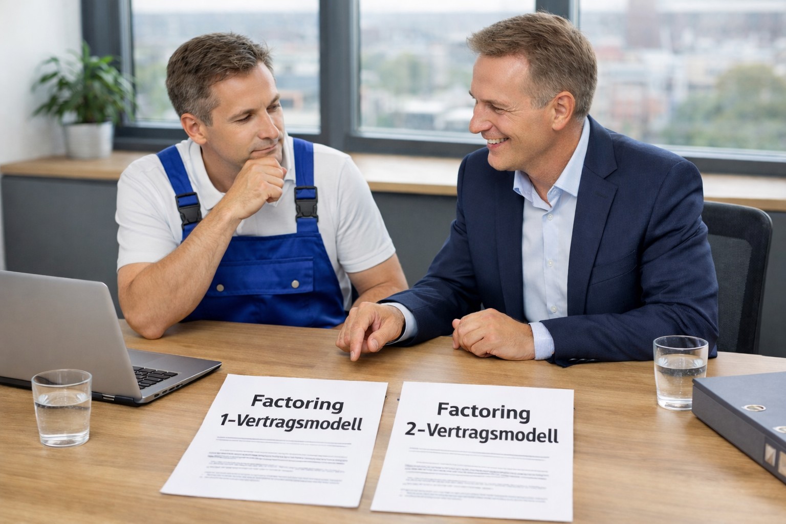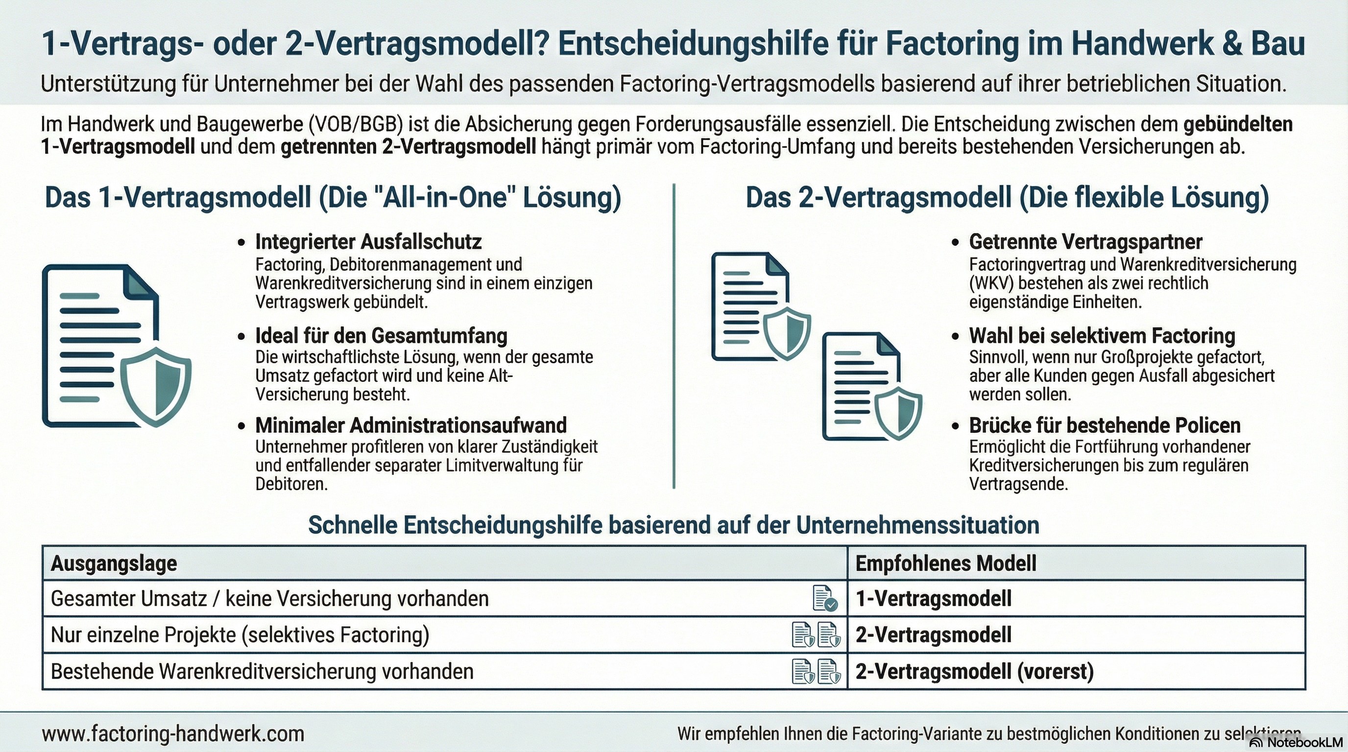 Im Handwerk und Bau ist nicht das Vertragsmodell entscheidend, sondern die saubere Strukturierung von Liquidität und Ausfallschutz. Wer den Gesamtumsatz factort und keine bestehende Versicherung hat, fährt meist mit dem 1-Vertragsmodell besser. Selektive Projektstrukturen können hingegen ein 2-Vertragsmodell erforderlich machen.